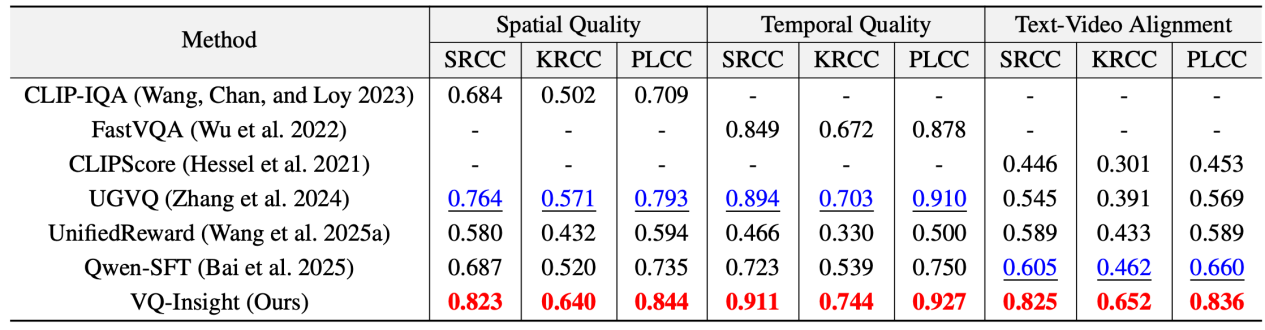 在AIGC多维度打分任务上,VQ-Insight能够在空间质量、时序质量和文本视频一致性打分上都取得最优性能。