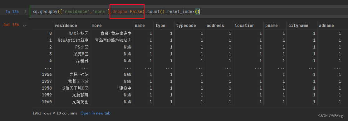 - 在pandas的函数中要特别注意对空值的处理和是否本地化改变数据。比如groupby就会:
