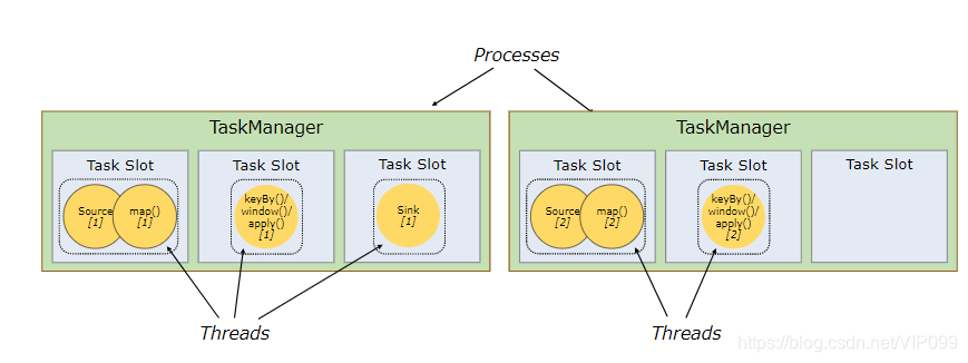 - 每个 task slots 代表 TaskManager 的一份固定资源(CPU、内存)。