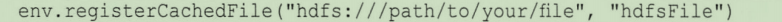 为程序注册 个文件或者目录(本地或者远程文件系统,如 HDFS ),通过 ExecutionEnvironment为它明明 。当程序执行时, Flink 自动将文件或者目录复制到所有 TaskManager 节点的本地文件系统,用户可以通过这 个指定的名称查找文件或者目录,然后从 TaskManager 节点的本地文件系统访问它。