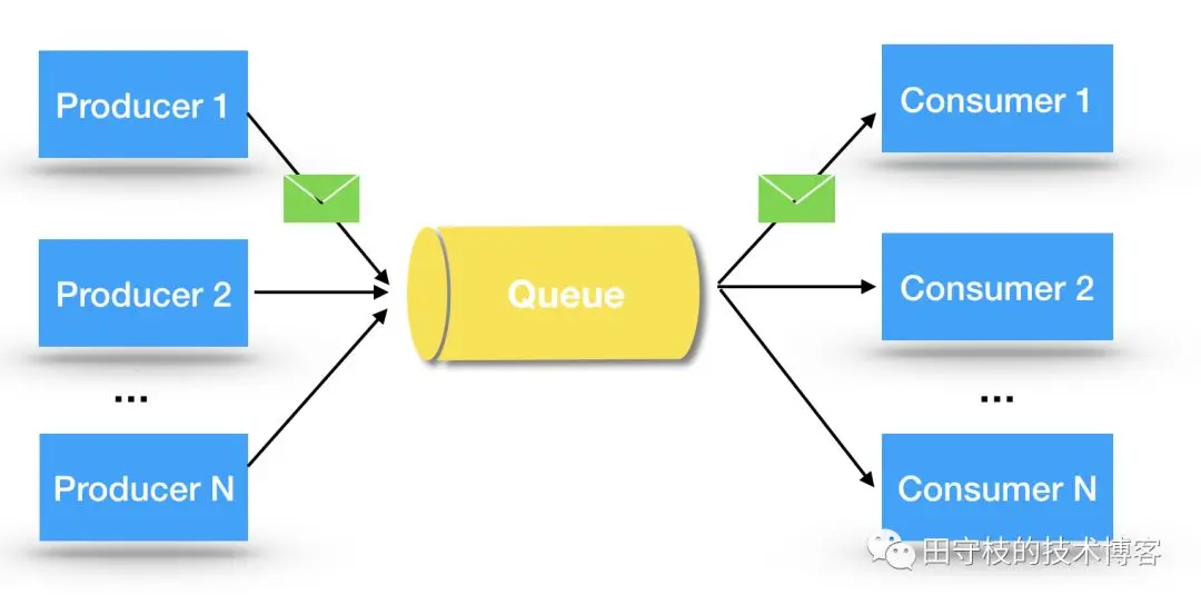需要注意的是,尽管这里使用Queue的概念,但并不是先进入队列消息,一定会被先消费。在存在多个下游Consumer情况下,一些消息中间件,例如ActiveMQ,为了提升消费能力,会将队列中的消息分发到不同Consumer并行进行处理。这意味着消息发送的时候可能是有序的,但是在消费的时候,就变成无序了。为了保证消费的有序,一些MQ提供了**"专有消费者”或者"排他消费者”**的概念,在这种情况下,队列中的消息仅允许一个消费者进行消费,如果存在多个消费者,那么从中选择一个。但是,这意味着在消息在处理中没有了并行性。如果消息量很多的情况下,将会产生消息积压。为了解决"专有消费者”的性能问题,一些消息中间件采用分区的概念来解决性能问题,我们将在后文进行介绍。