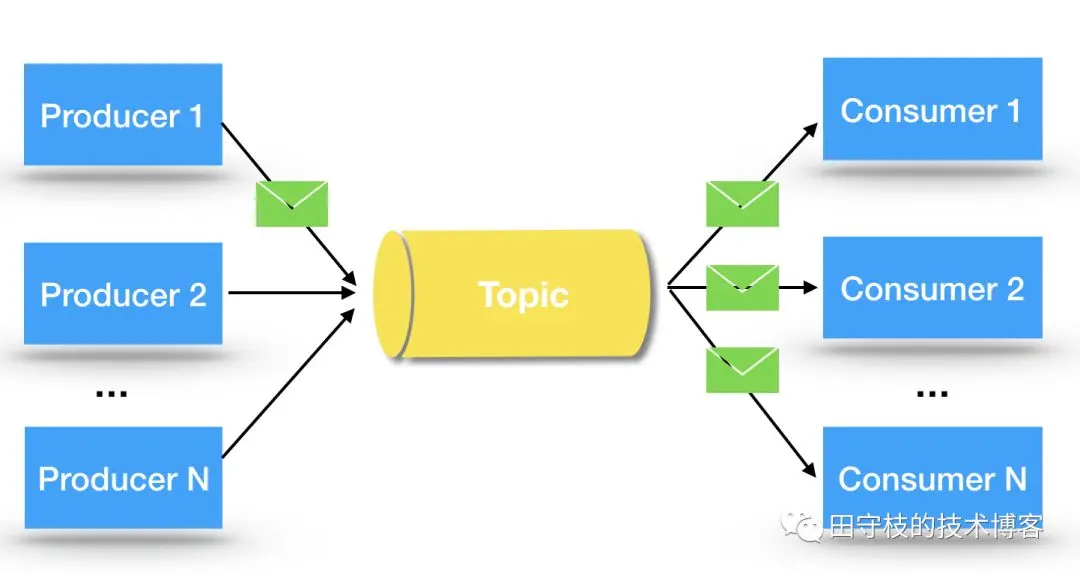 publish-and- subscribe, 即发布订阅模型。在Pub/Sub模型中,生产者将消息发布到一个主题(Topic)中,订阅了该Topic的所有下游消费者,都可以接收到这条消息。如下图: