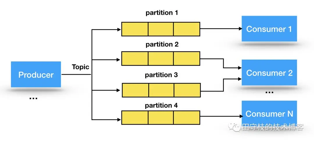 为了解决在PTP模型下,有序消息需要通过"专有消费者”消费带来的性能问题,一些消息中间件,如rocketmq,kafka采用了Partition模型,即分区模型,如下所示: