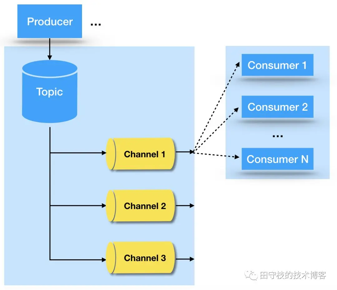 生产者还是将消息发送到Topic中,针对一个Topic,可以创建多个通道,这里称之为channel。与分区不同的是,发送到Topic中的每条消息,都会转发到每个channel,因此每个channel都有这个Topic的全量数据。当然,没有必要把真的把消息体完整的拷贝一份到channel中,可以只记录一下消息元数据,表示有一条放到这个channel中了。消费者在消费消息时,必须指定从哪个channel消费。多个消费者消费同一个channel时,每条消息只会有一个消费者消费达到,这一点与PTP模型类似。事实上,我们可以认为,消费了同一个channel的消费者,就自动组成了一个消费者组。但是,与Partition模型不同的是,这里没有分区的概念,因此消费者的数量可以是任意的。事实上,GO语言编写的NSQ消息中间件,采用的就是这种模型。当然,这种模型与PTP一样,也不能保证被消息有序,除非通过类似于”专用消费者”的概念。