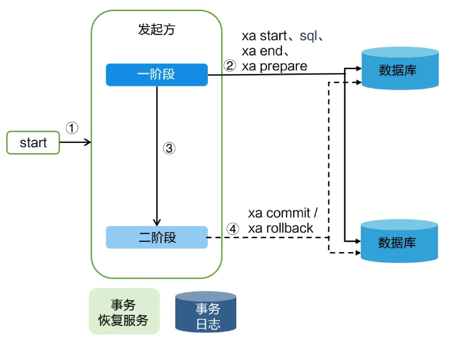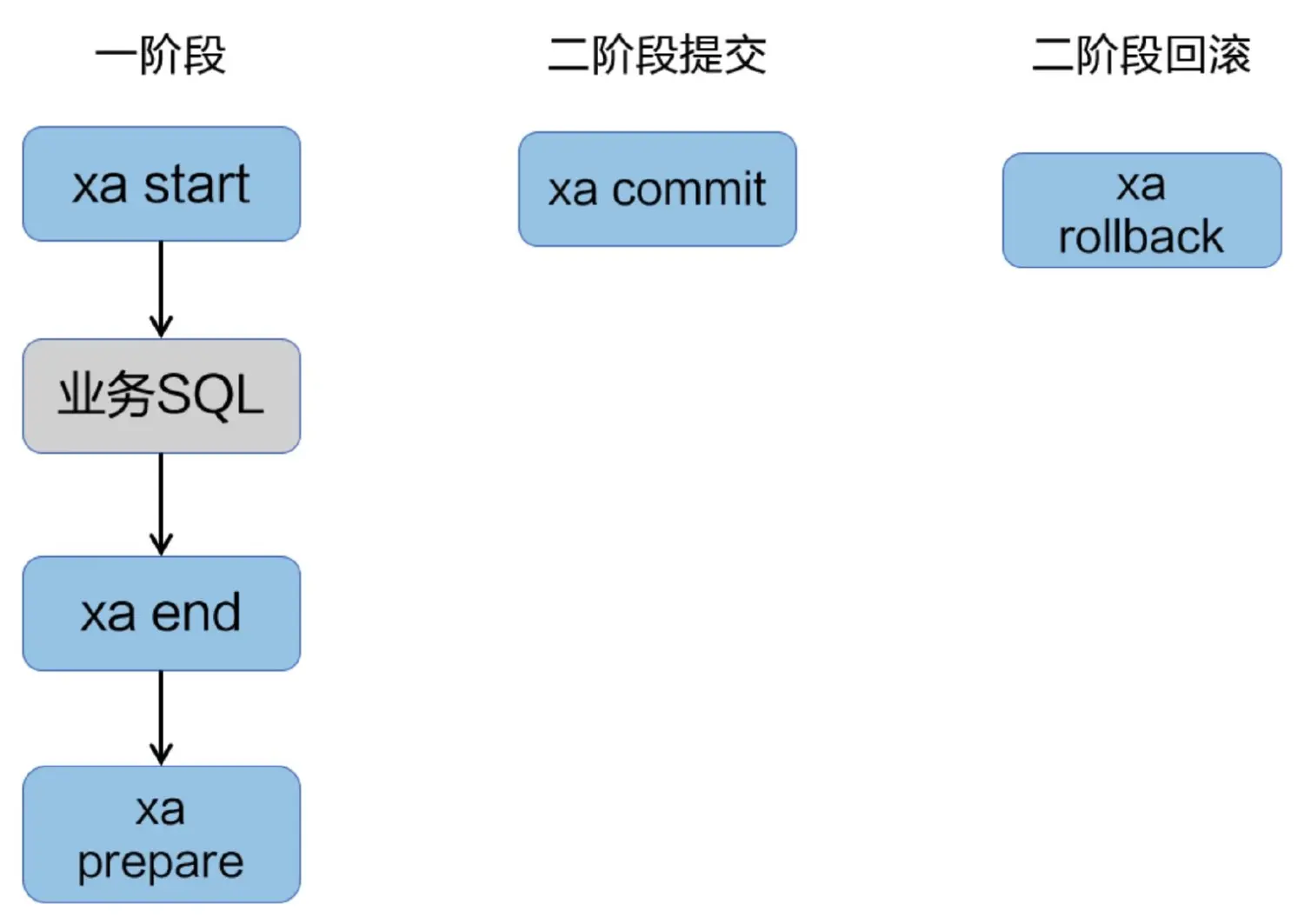 XA 协议有一系列的指令,分别对应一阶段和二阶段操作。“xa start” 和 “xa end” 用于开启和结束XA 事务;“xa prepare” 用于预提交 XA 事务,对应一阶段准备;“xa commit”和“xa rollback”用于提交、回滚 XA 事务,对应二阶段提交和回滚。