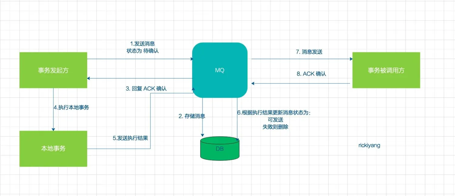 基于这个思路, 在 MQ 中存储消息的状态才是真理,消息生产者先把消息发送给MQ,此时消息状态为“待确认”,接着生产者去执行本地事务,如果执行成功就给MQ发送消息让他更改消息状态为 “待发送”并发送消息,如果执行失败则删除消息。