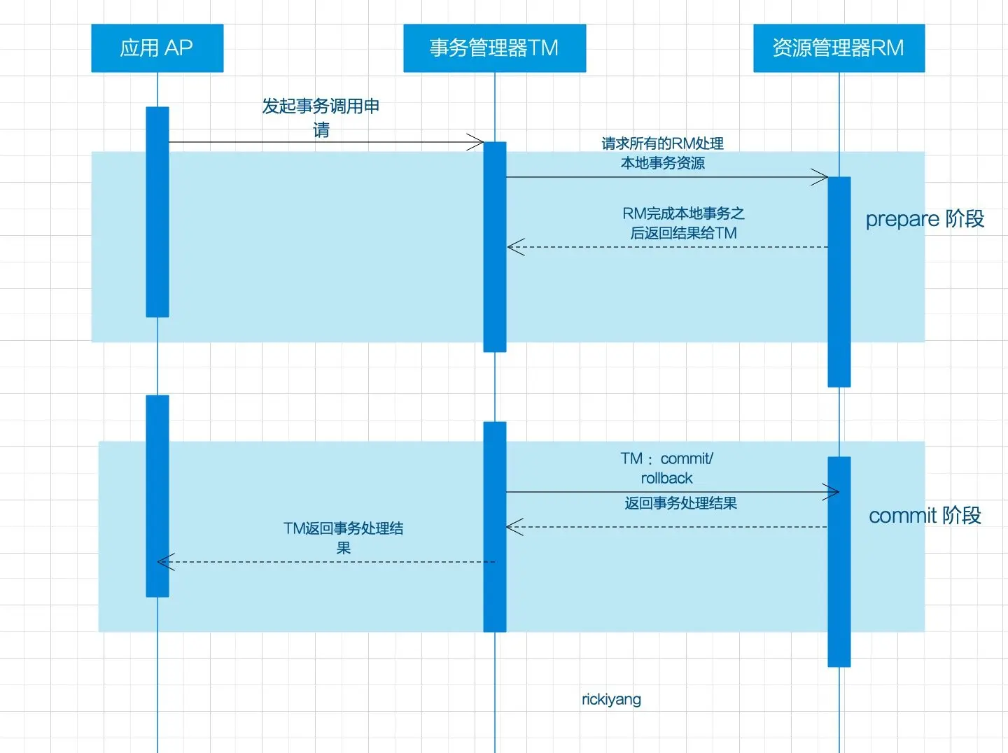 - 第二阶段 (commit/rollback):事务管理器根据所有本地资源管理器的反馈,通知所有本地资源管理器,步调一致地在所有分支上提交或者回滚。