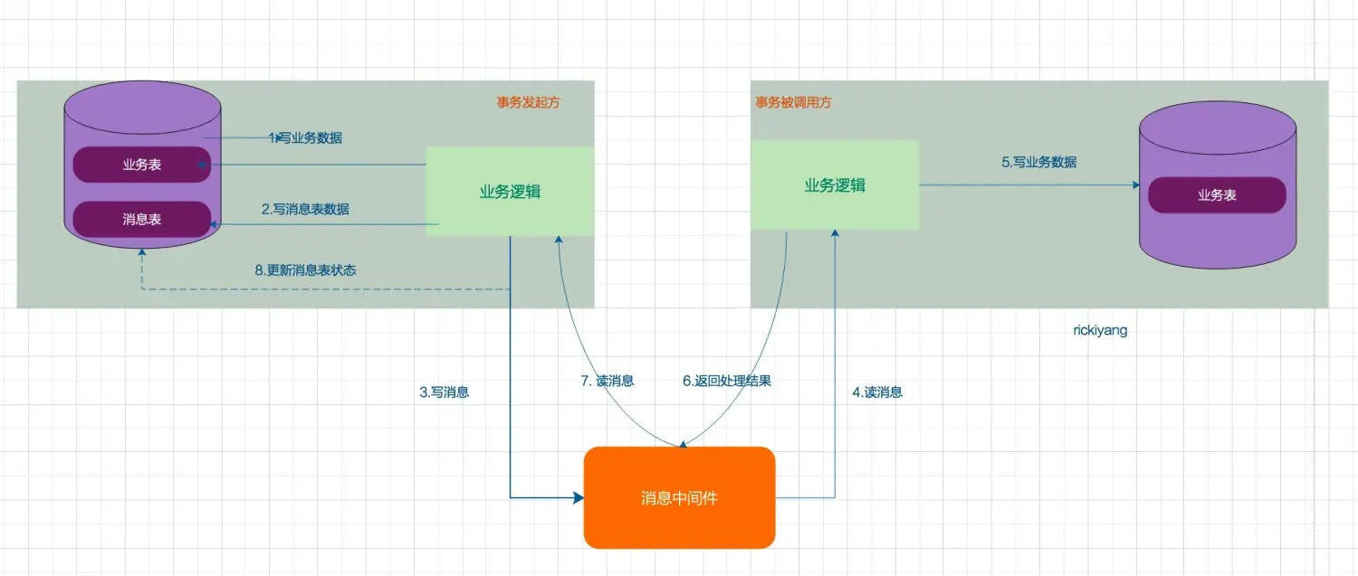 方案通过在事务主动发起方额外新建事务消息表,事务发起方处理业务和记录事务消息在本地事务中完成,轮询事务消息表的数据发送事务消息,事务被动方基于消息中间件消费事务消息表中的事务。