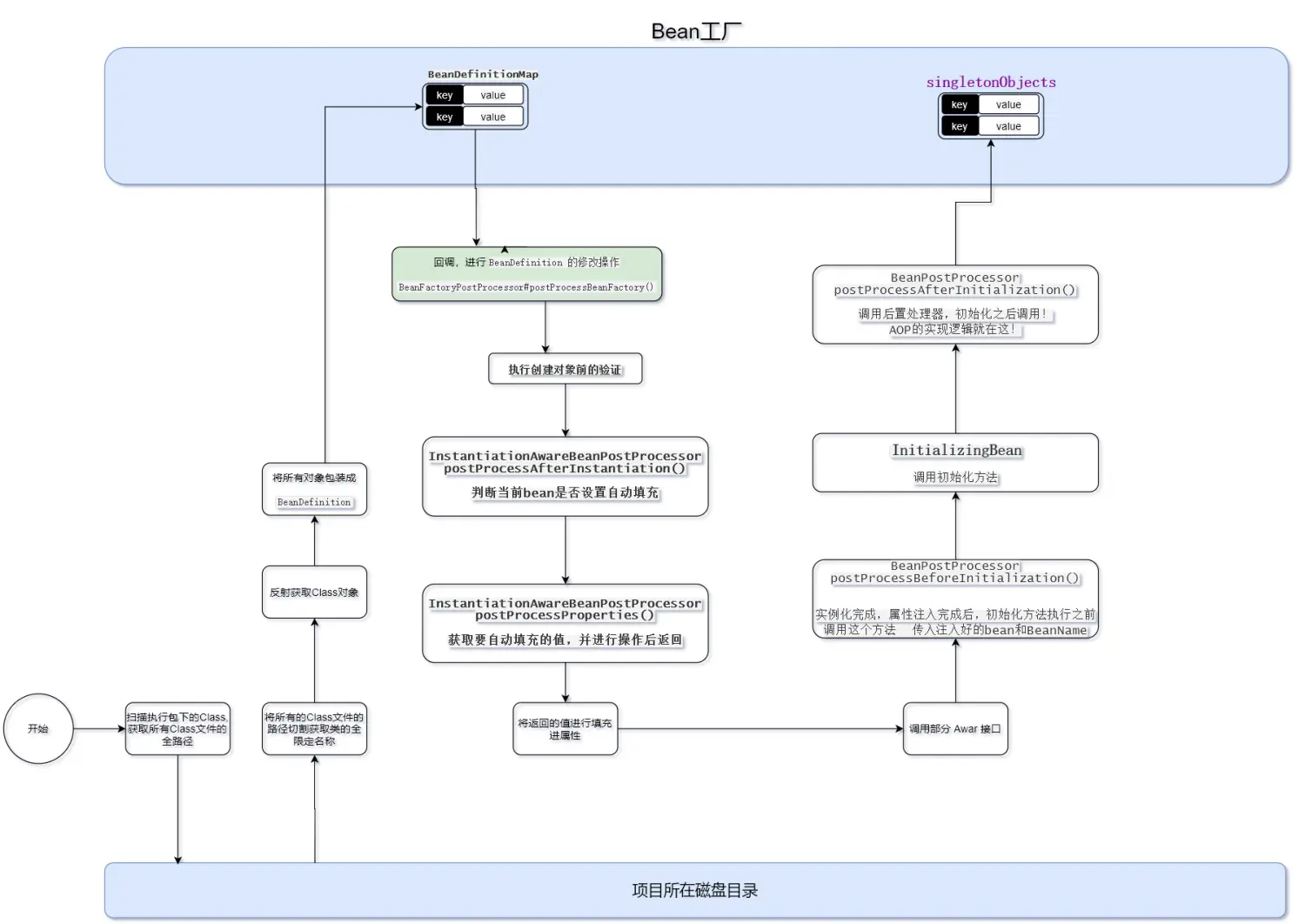 自己实现看起来,整个流程就很清晰,扫描、创建、注入、代理、保存一应俱全,但是Spring的实现方式远比我们自己实现的要复杂的多得多!