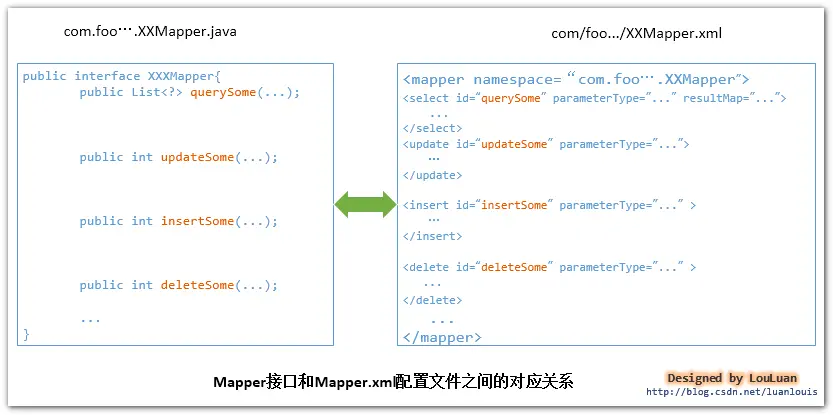 MyBatis 将配置文件中的每一个<mapper节点抽象为一个 Mapper 接口,而这个接口中声明的方法和跟<mapper节点中的<select|update|delete|insert 节点项对应,即<select|update|delete|insert 节点的id值为Mapper 接口中的方法名称,parameterType 值表示Mapper 对应方法的入参类型,而resultMap 值则对应了Mapper 接口表示的返回值类型或者返回结果集的元素类型。