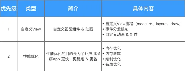 针对Android进阶知识,按照优先级最主要的知识点主要包括:自定义View、性能优化,具体介绍如下: