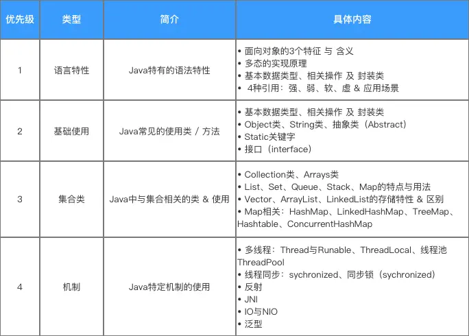 对于学习Java,我们移动端开发学习Java不需要后端那么深入,我认为作为Android开发者,学习的内容包括:语言特性、基础使用、集合类&机制。具体介绍如下: