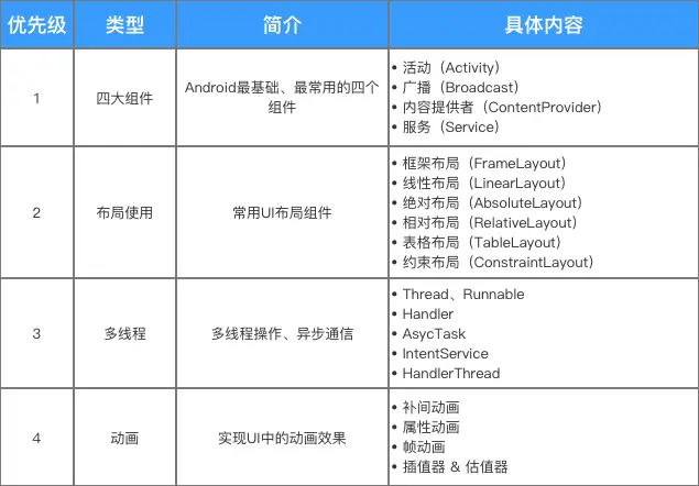 - 针对Android基础&常用知识,我认为对于初级开发者来说,按照优先级最主要的知识点主要包括:四大组件、布局使用、多线程 & 动画;