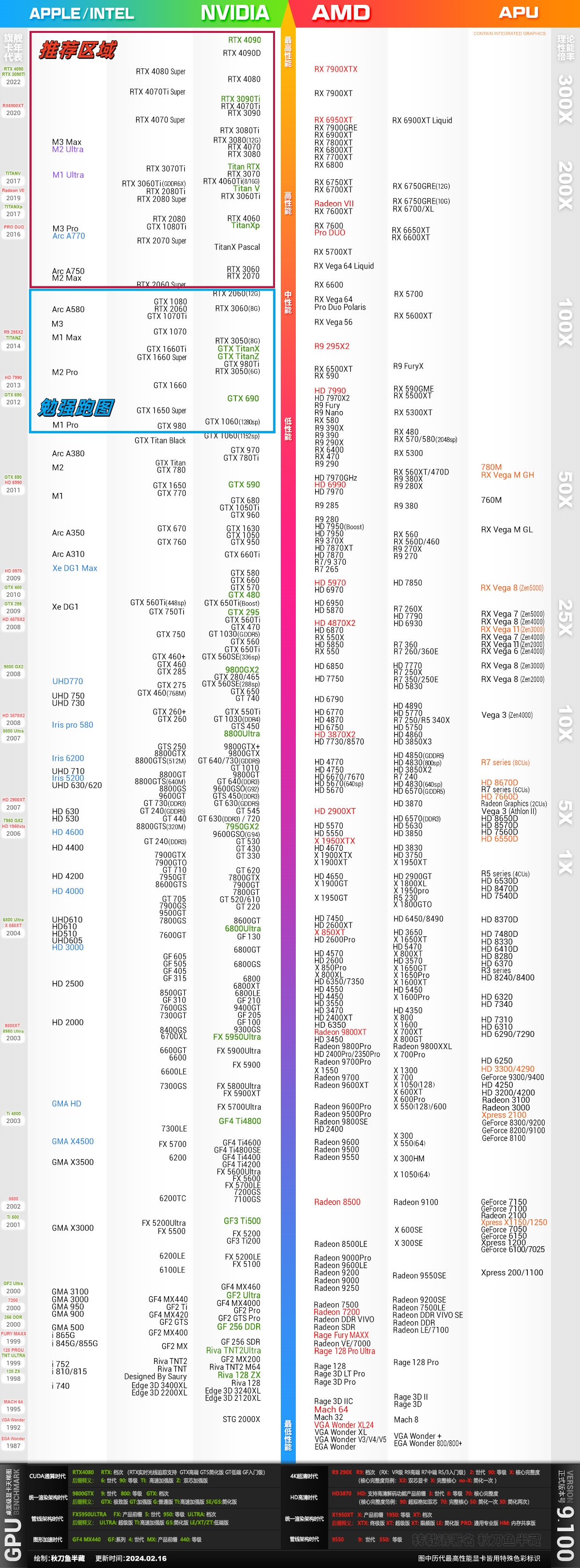 下面是一张在网络上收集整理的显卡天梯图(最新型号已更新至5090),规格型号涵盖了主流显卡的全部规格,大家可以对照图中规格查看自己的电脑显卡是否满足SD本地部署需求。