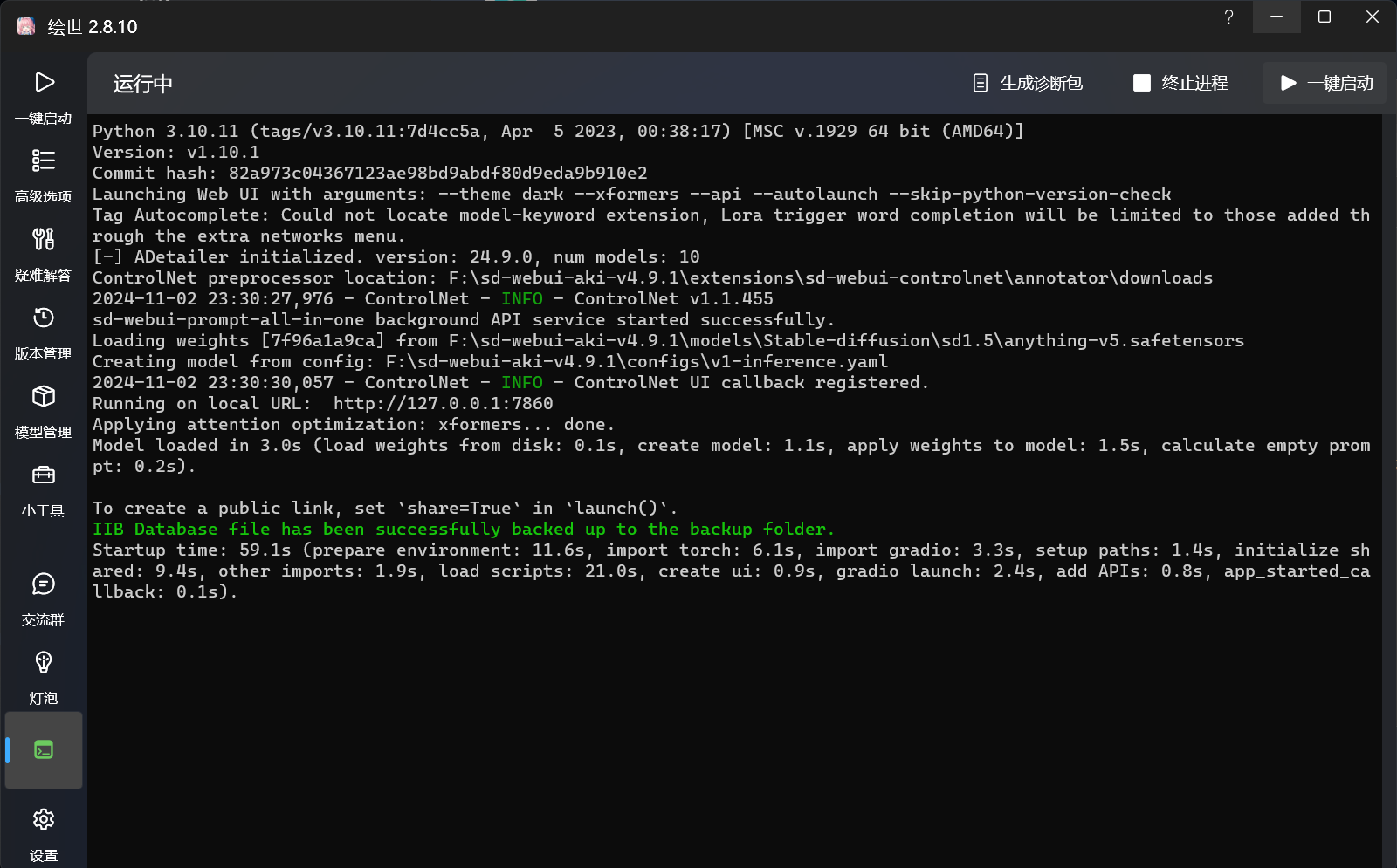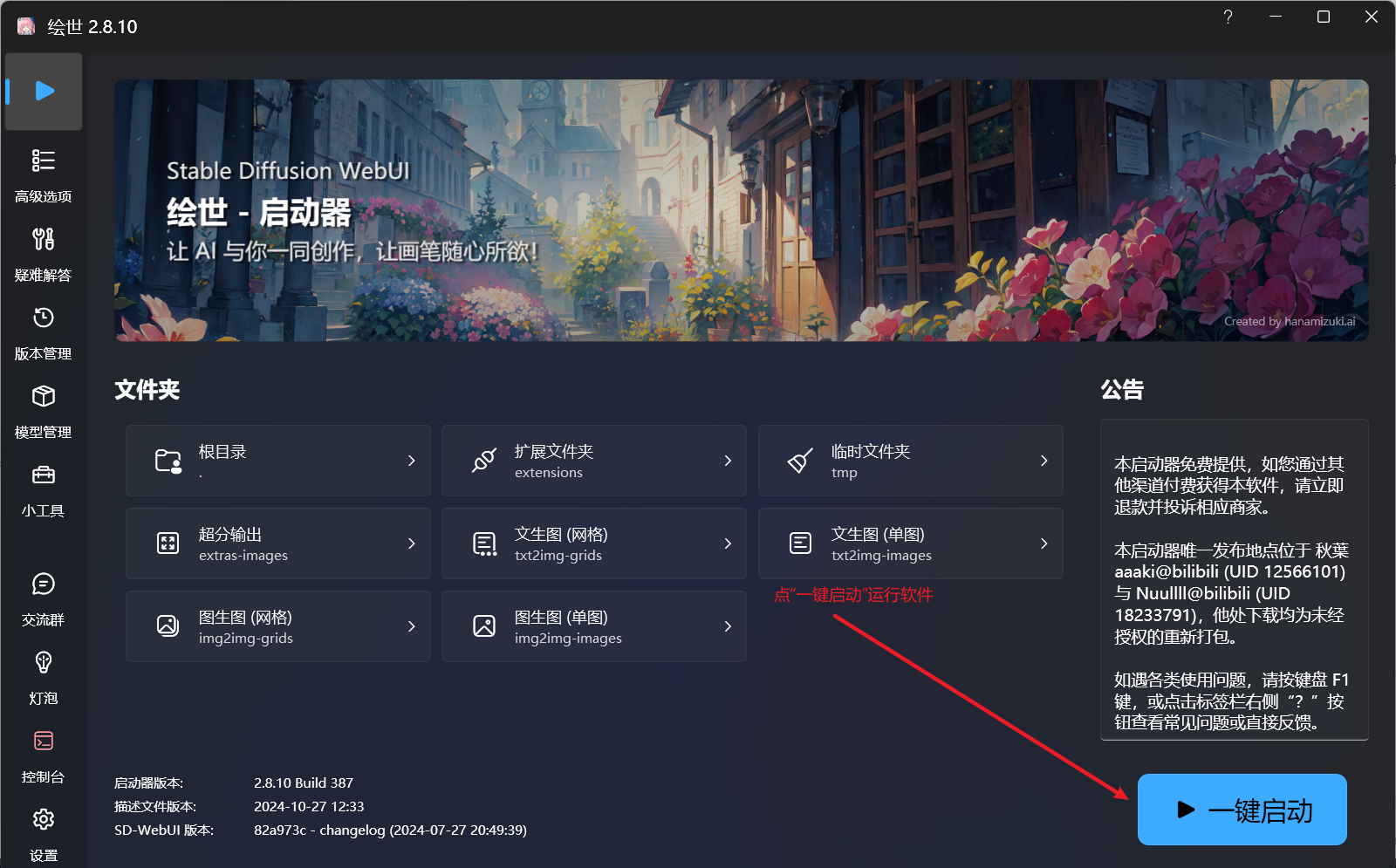 4、进入绘世启动器,点击“一键启动”,等待后台运行,即可进入SD-webui工作界面