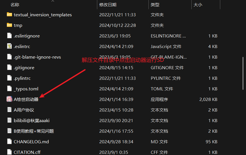 3、解压后的文件,目录重找到“A绘世启动器”图标,点击运行SD