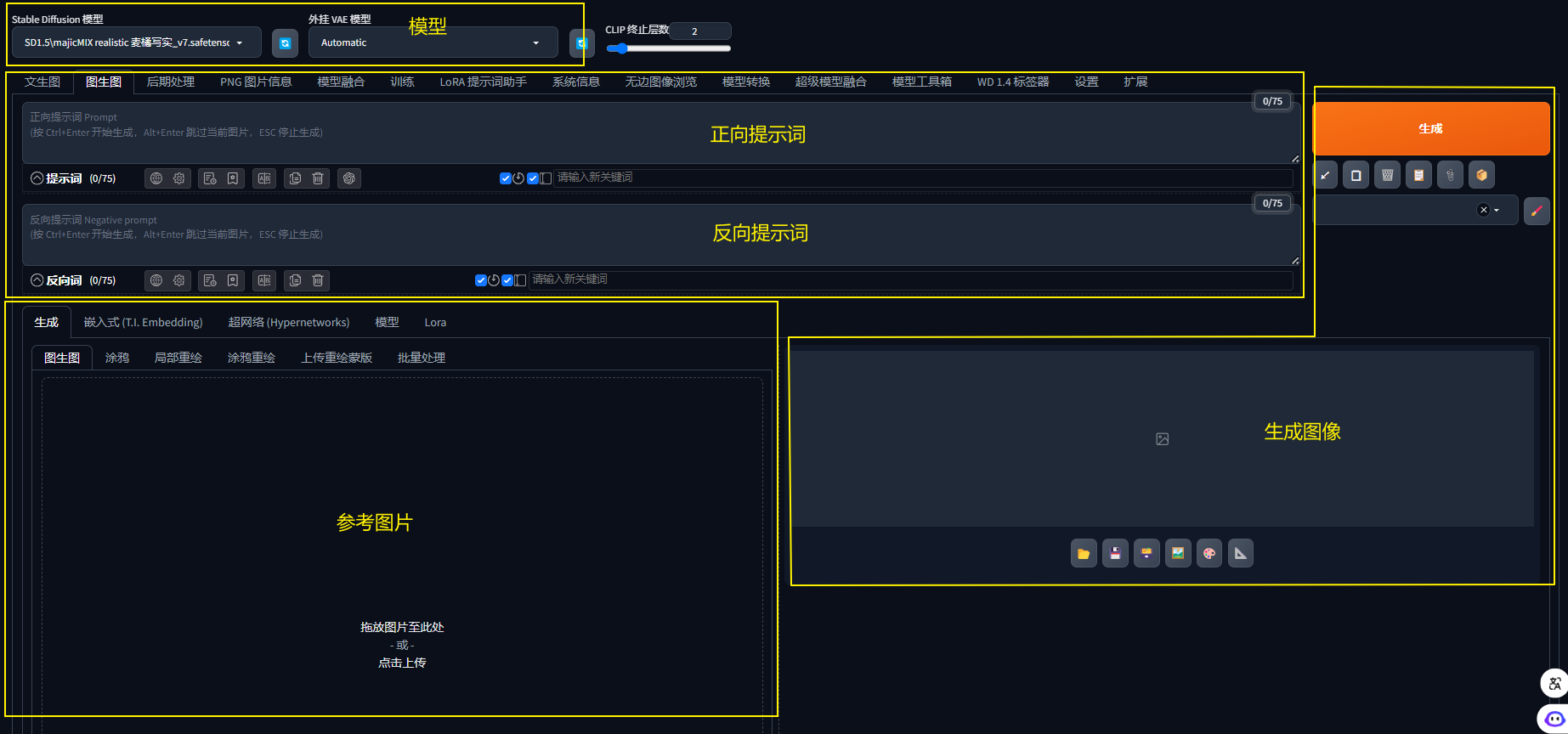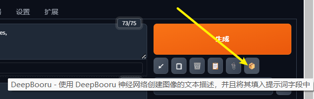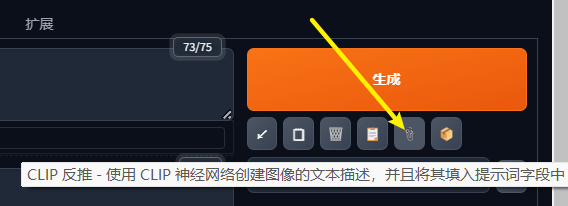 在图生图模式下,右侧生成按钮下面多出两个功能键,主要用于反推出参考图片的提示词信息,方便用于自动生成更加精确的提示词对画面进行描述。