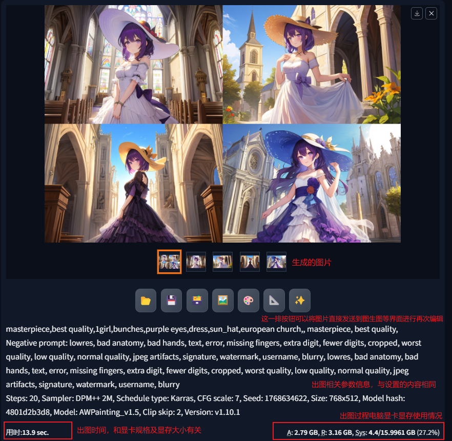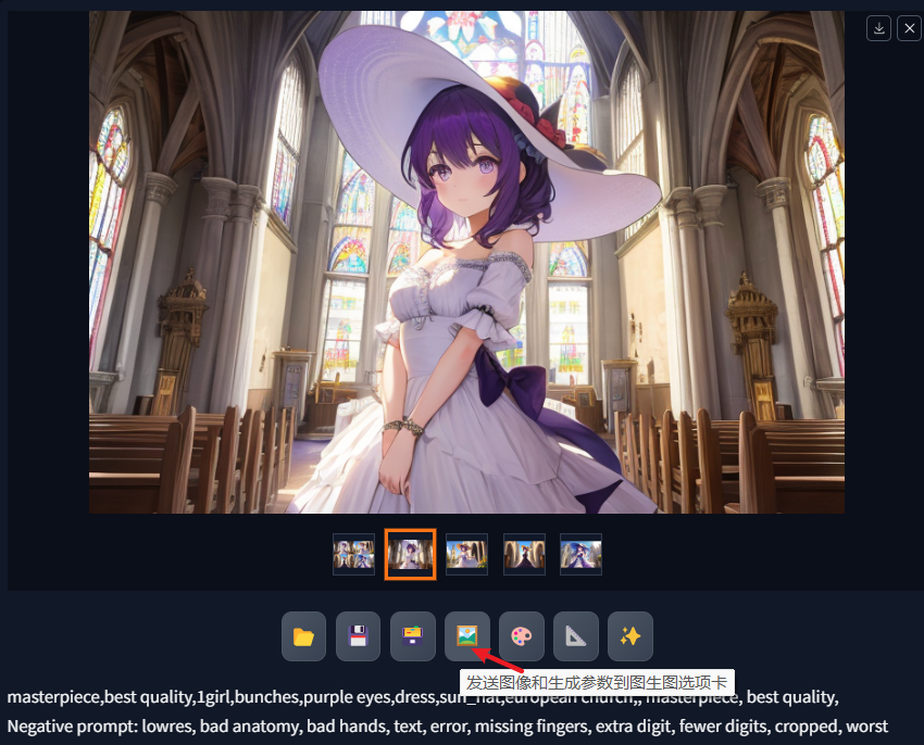 除了加载图像进行图生图外,也可以在文生图流程界面选择文生图所生成的一张图,点击下面按钮中的发送图片到图生图,直接进入图生图模式进行编辑。