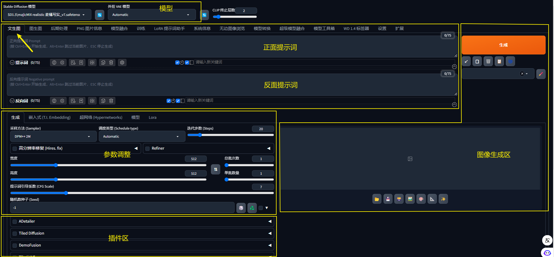 通过上文我们对web-UI的界面分区有了初步认识,本篇文章我们一起来操作,试一试如何实现基础的文生图和图生图。