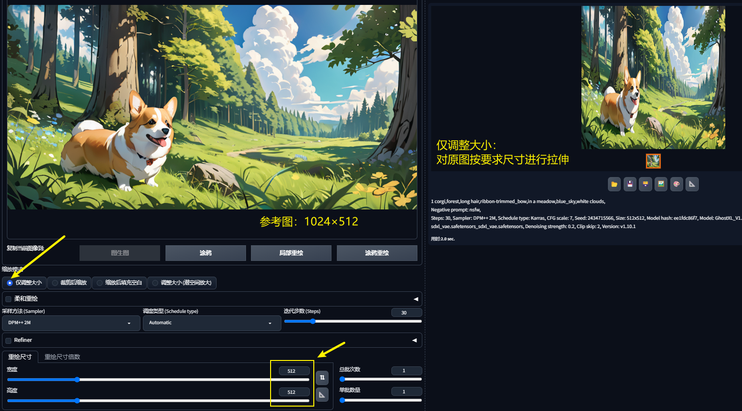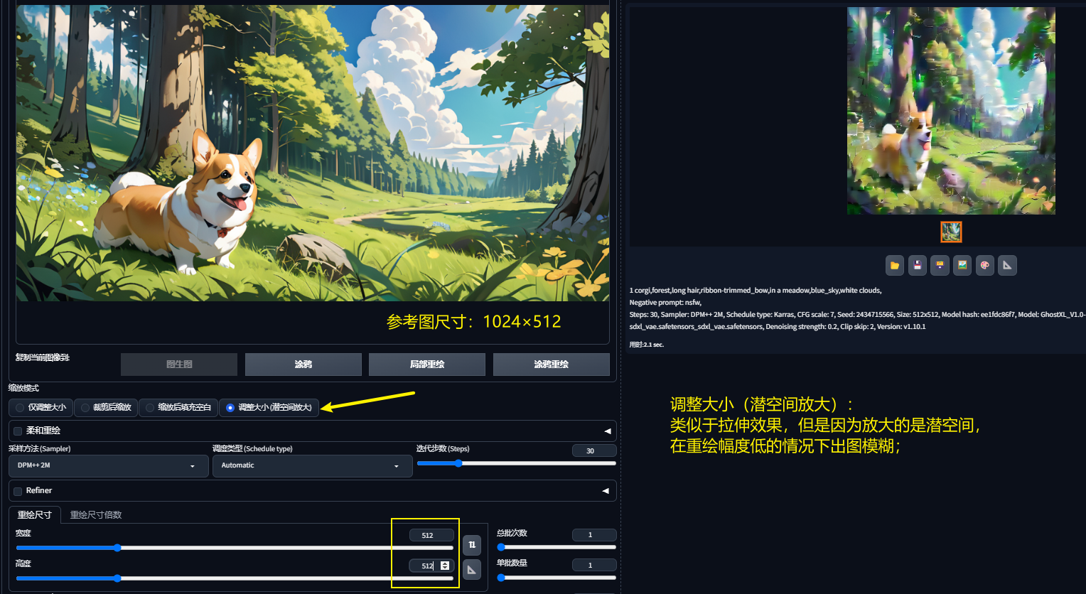 调整大小(潜空间放大):类似于拉伸效果,但是因为放大的是潜变量所以导致模糊,需调高重绘幅度才能出现正常图像。