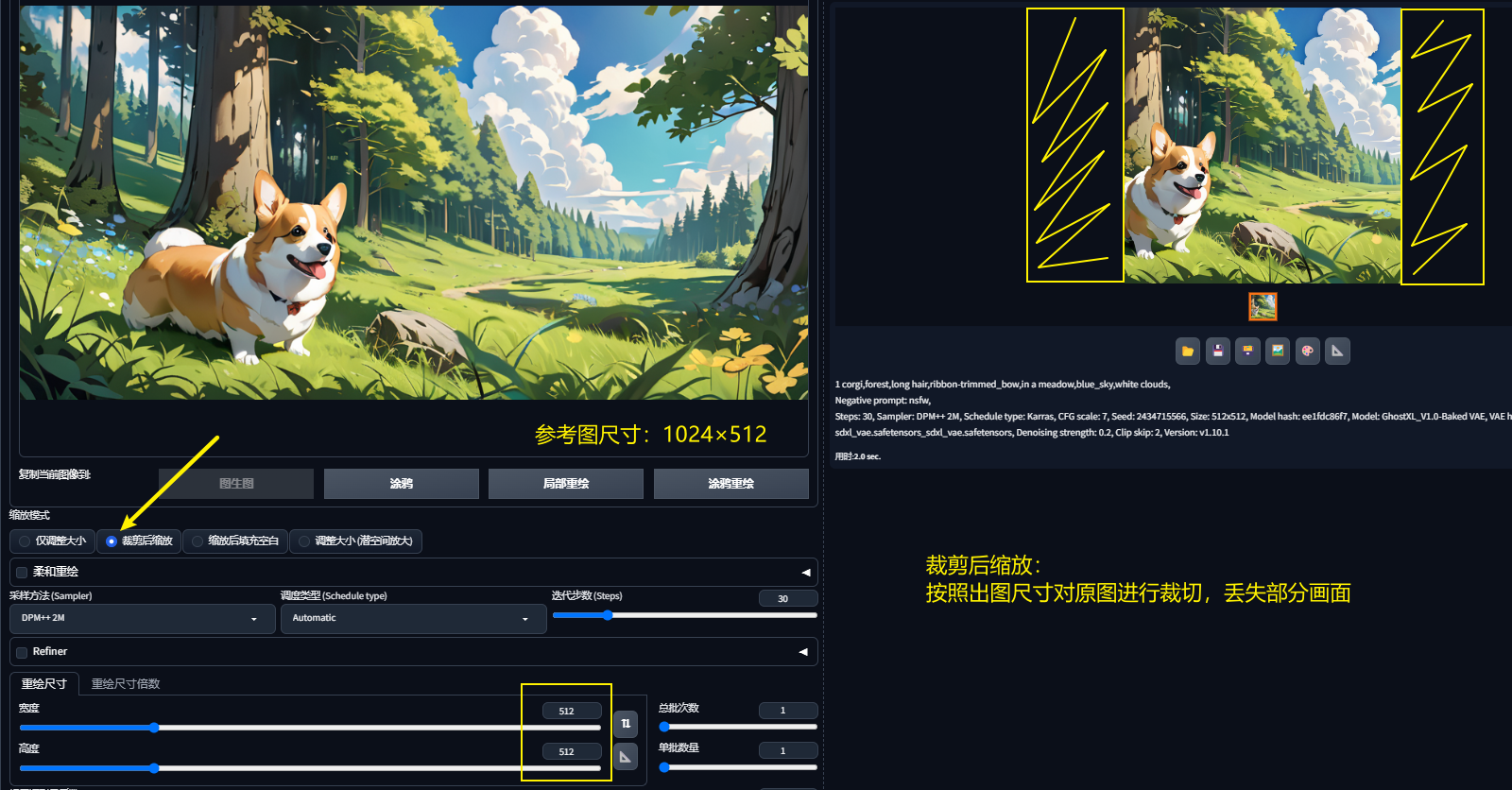 裁剪后缩放:按照出图尺寸对原图进行裁切,会丢失部分画面;