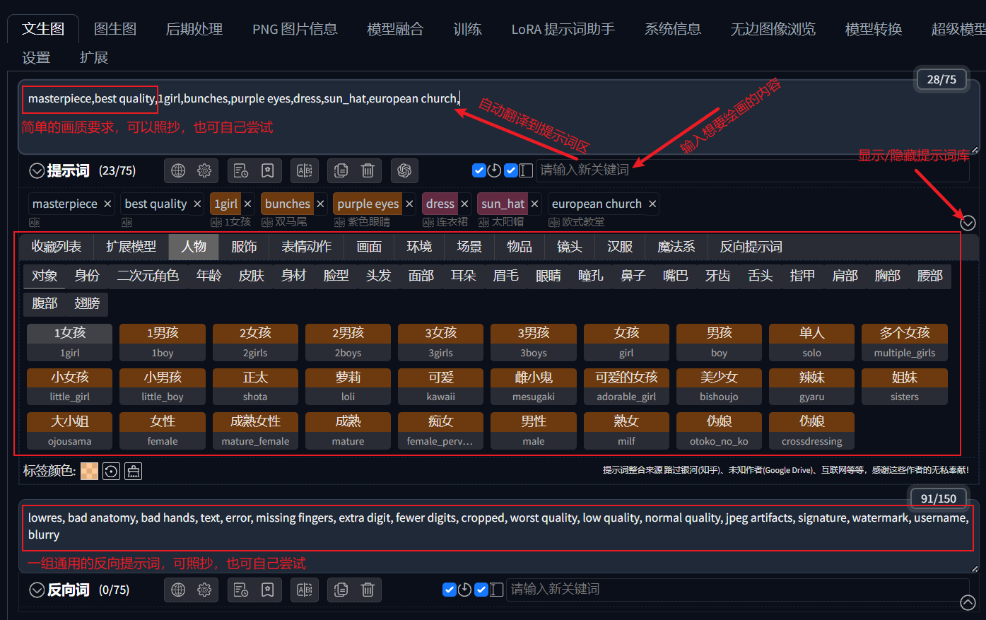 其余想要生成的内容可以通过自行输入提示词或点击提示词库中的词条进行组合,这里我们通过提示词库点击输入一组词条:1个女孩、双马尾、紫色眼睛、连衣裙、太阳帽、欧式教堂(大家可以根据想象内容自行发挥,无需照抄!)