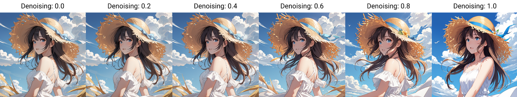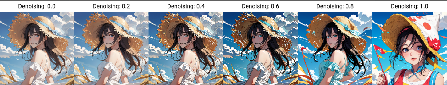 重绘幅度:在参考图基础上的变化程度,重绘幅度越小则越接近原图,重绘幅度越高与原图变化越大,超过一定数值则有可能由SD自由发挥。上图为一组重绘幅度递增的对比图,从0至1,可以看到重绘幅度越高,重绘图像与原图差距越大。
