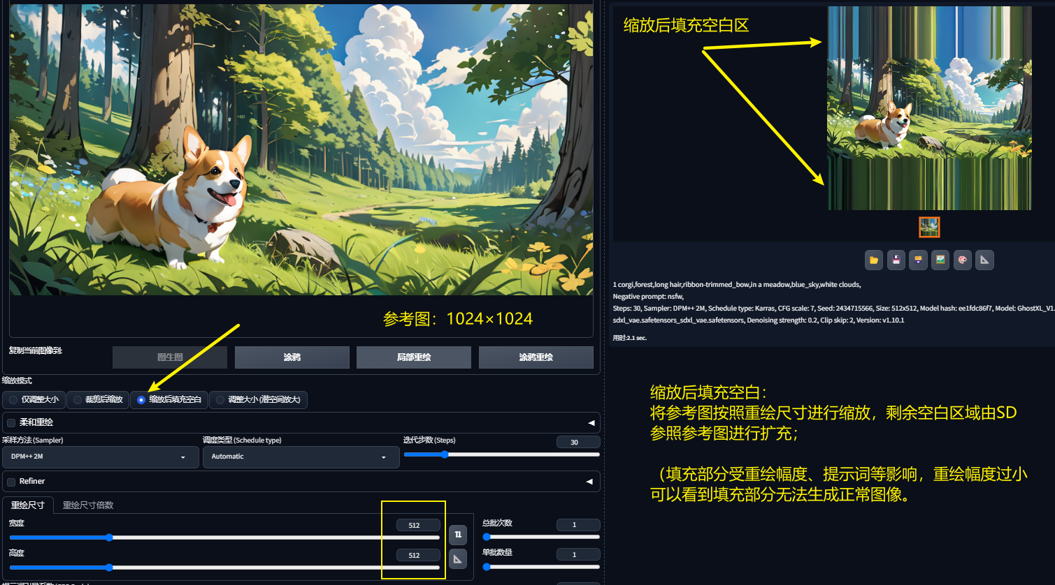 缩放后填充空白:按照重绘尺寸对参考图进行缩放,剩余的空间由SD参照参考图进行扩充。(扩充区域效果受重绘幅度及提示词影响,实例图中重绘设置为0.2,可以看到填充区域未生成完整图像;但是当重绘幅度调高后,与参考图的对比度也会有所变化;)