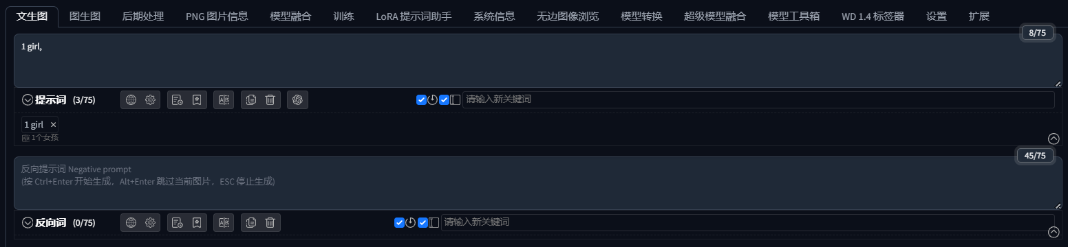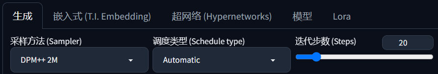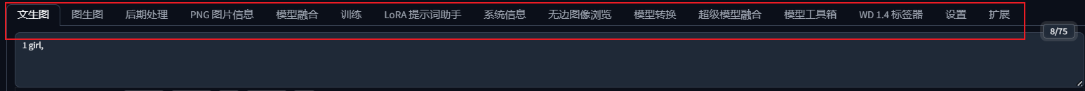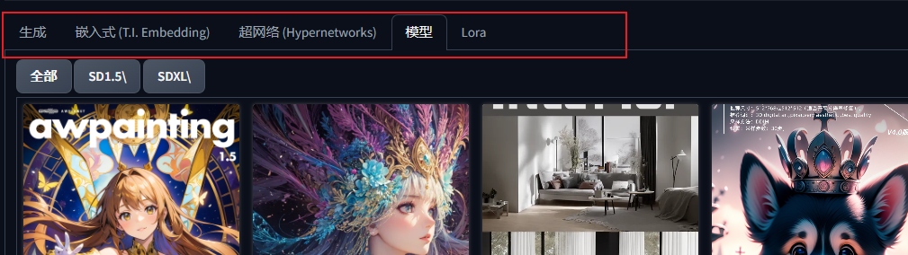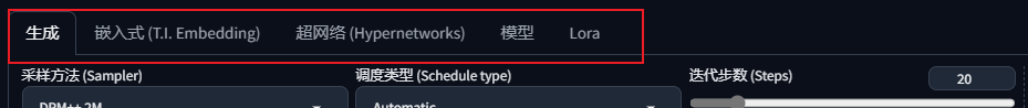 “提示词区”下方的功能选项卡:这里除“生成”页面内调整出图参数、启用功能插件外,其余几个选项卡是指不同类型的模型,点击相应页面内的模型,会自动调用。(“嵌入式”、“超网络”及“lora”指微型模型,在后文进行具体说明)。