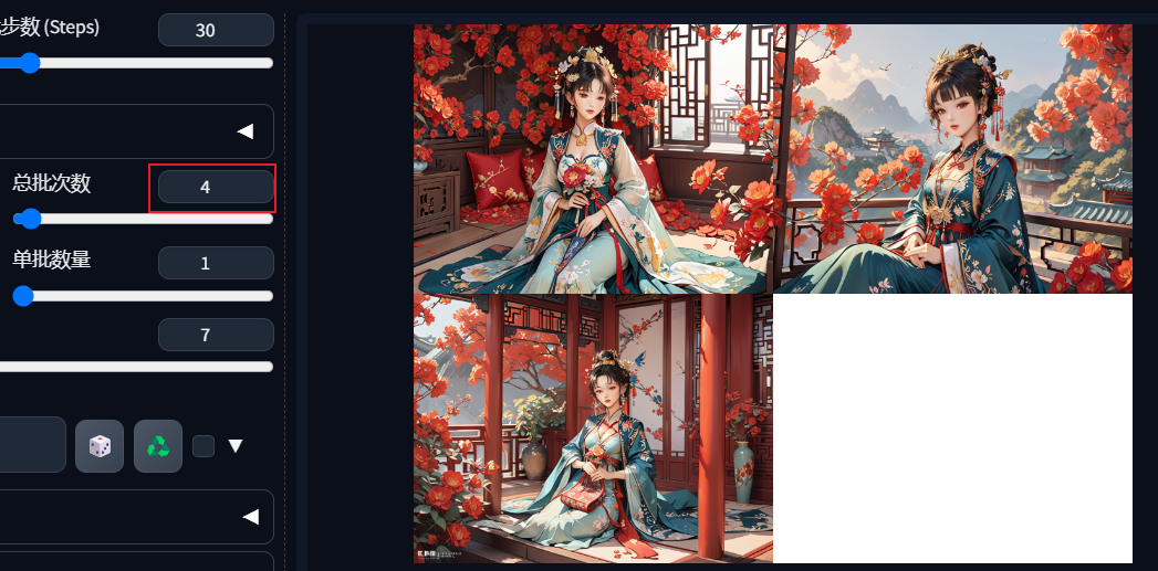 总批次“4”,生图到第3张时点击“中止”,停止第四张图生成