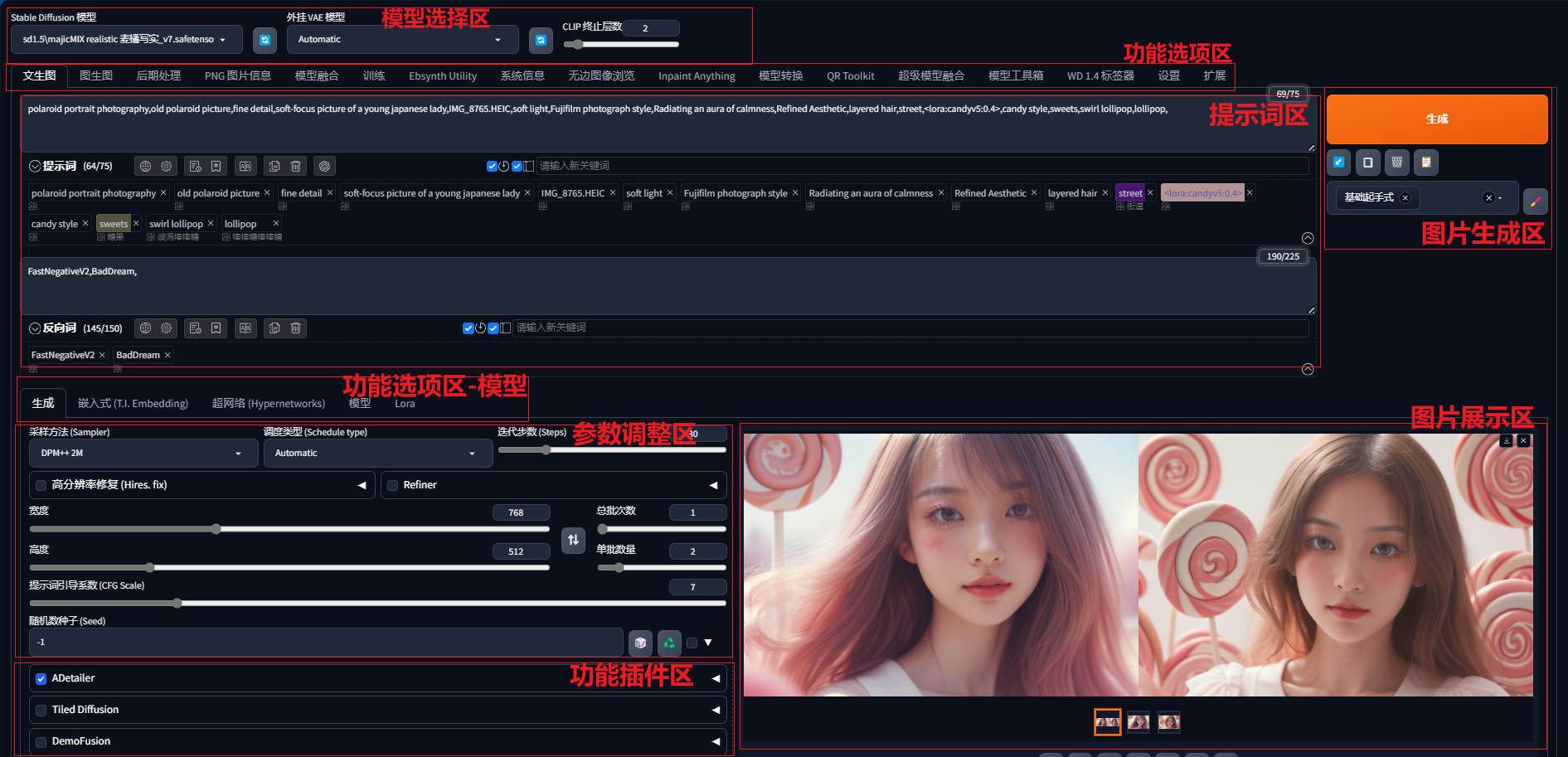图片展示区:用于展示所生成图片文件的效果,同时底部会显示图片生成的相关参数信息。