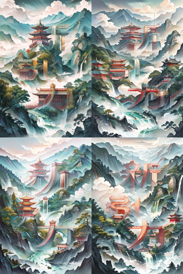 大家可以在各类网站上看到很多精美的山水藏字图片,这些图片都可以通过SD进行制作。山水藏字的实现方法有多种,但无论使用哪种方法,底层逻辑都是通过约束controlnet控制住字体的轮廓,再结合大模型+提示词+lora+其它controlnet进行美化。