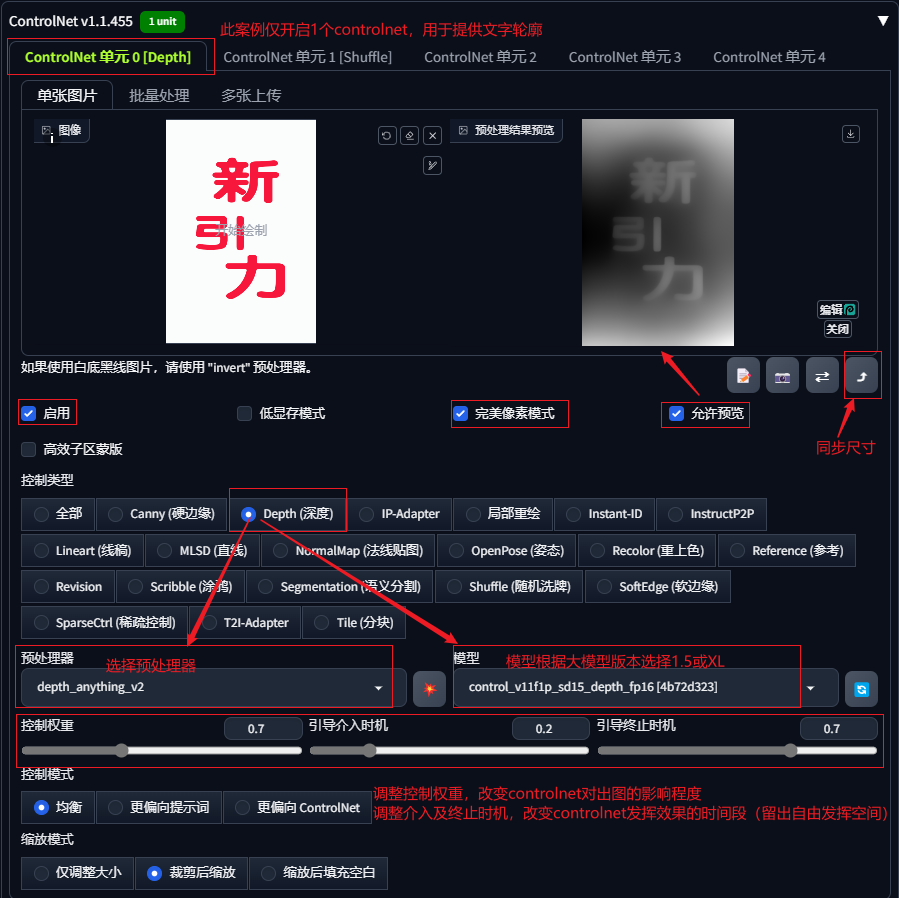 controlnet0中,上传底图,控制类型选择“深度”对图像轮廓进行约束。