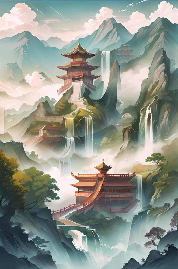 正向提示词:Chinese landscape painting,Big rivers,High mountains,cloud,Temple,Wooden boat,Knight-errant world,minimalism,Extreme detail,Unparalleled details,Best quality,