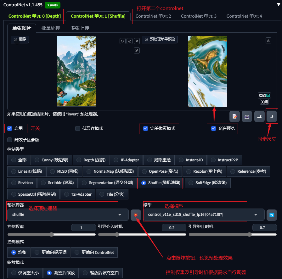 controlnet1中,上传参考图(选择与目标图像色彩风格一致的图片),控制类型选择“Shuffle随机”