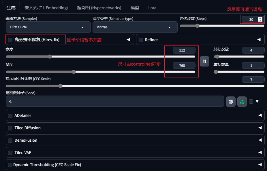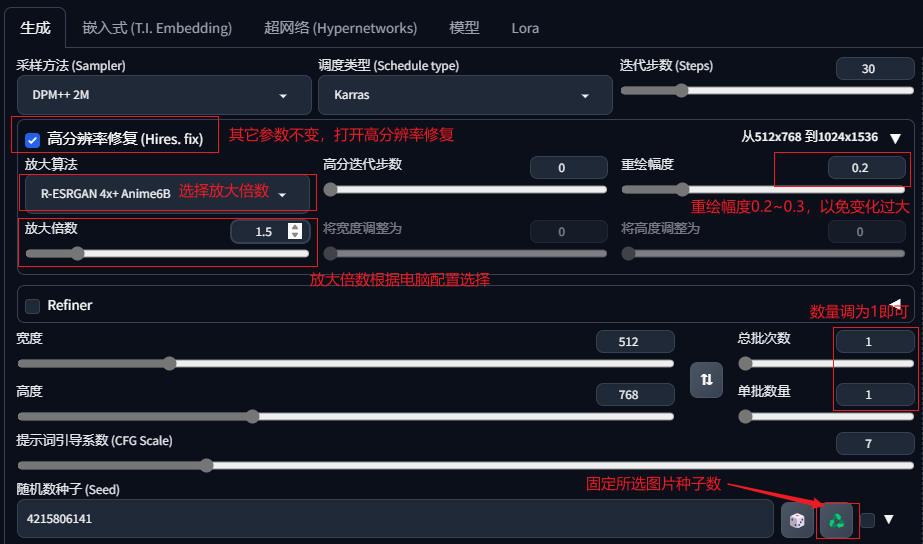 高分辨率修复:抽卡阶段可以暂不勾选,待挑选到心仪图像后再固定种子,勾选高分辨率修复进行图片放大。