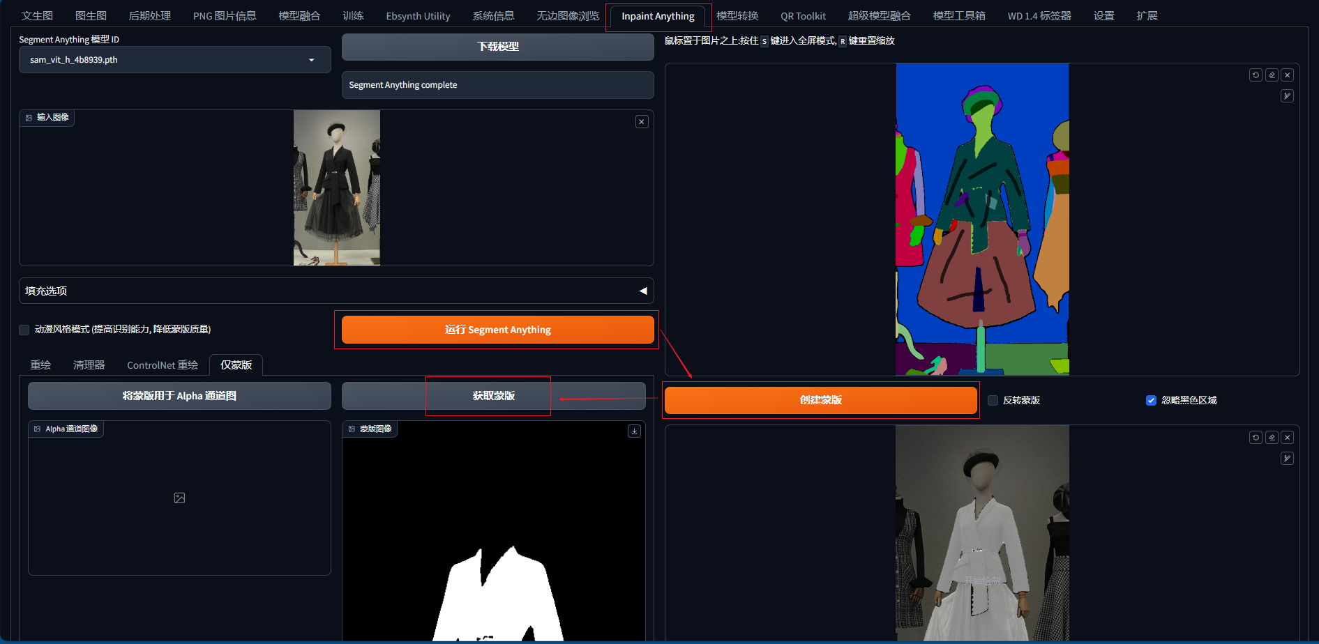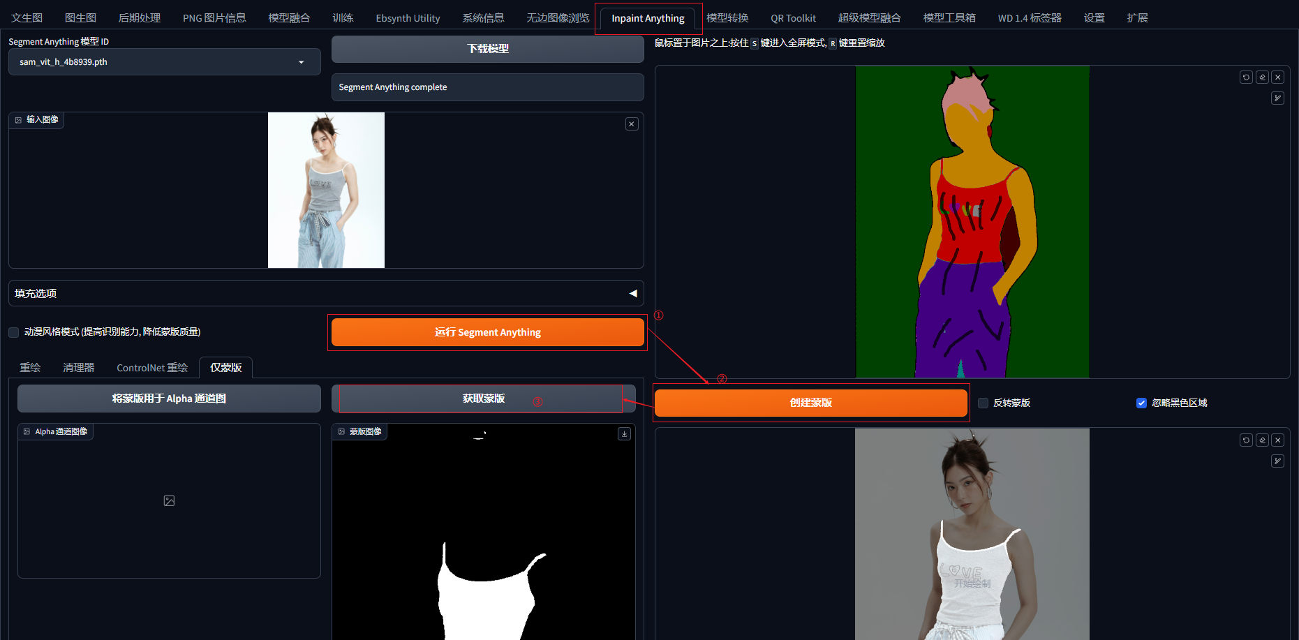 或通过inpaint anything页面上传模特图,获得底图的色块图再进行蒙版选择。