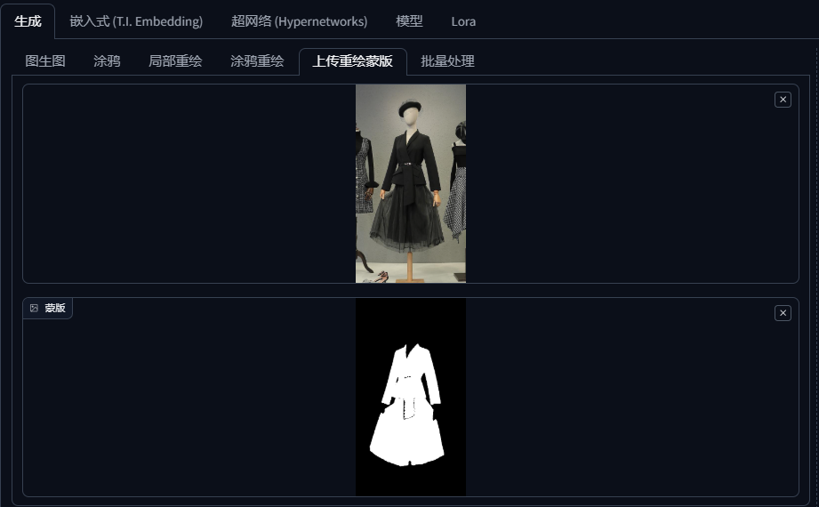 模特换装以及人台转真人模特用到的方法都是图生图中的局部重绘功能,它们都需要获取衣服的蒙版,区别点在于模特换装是重绘衣服蒙版区域,人台转真人模特是重绘非蒙版区域。