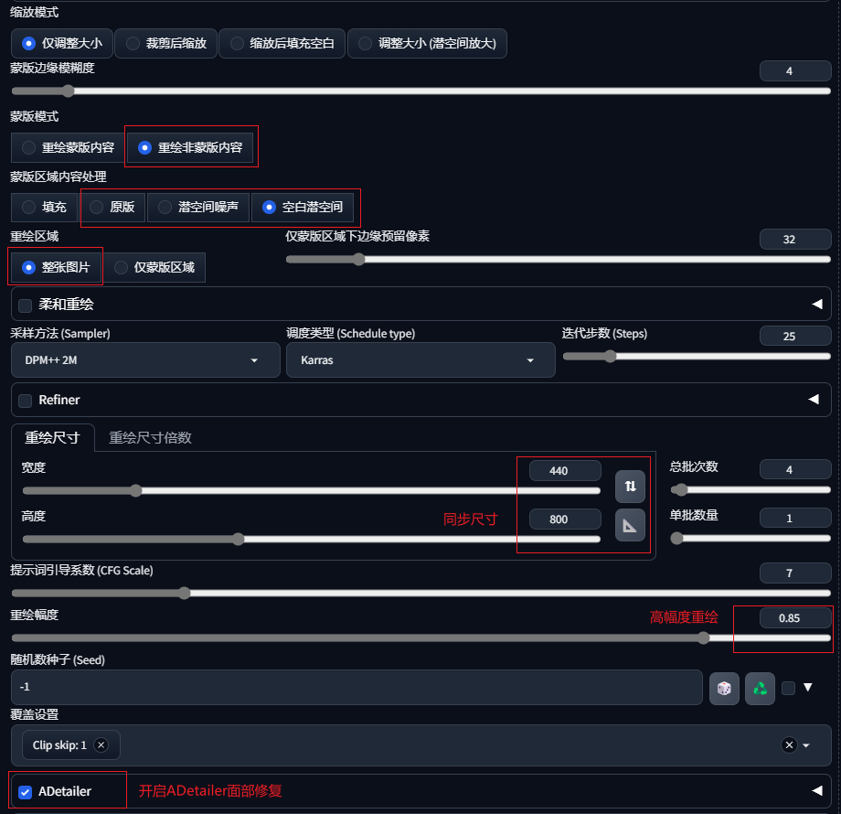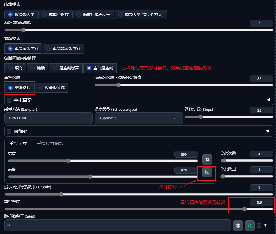 注意图片尺寸需与原图同步尺寸,重绘模式选择“重绘蒙版内容”,重绘方式注意选择“仅蒙版区域”,重绘幅度需要适当调高。