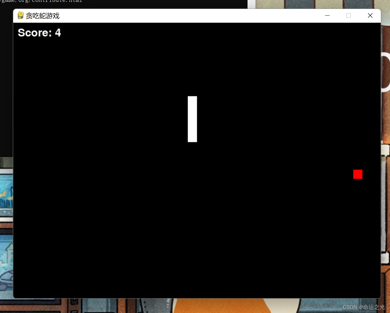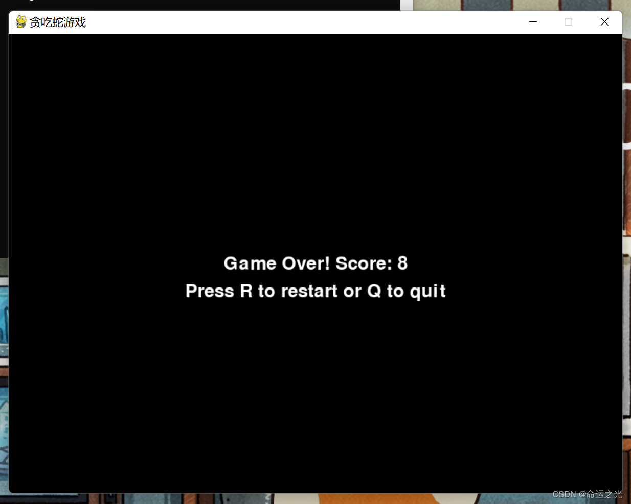 - 游戏结束:当贪吃蛇头部与游戏界面边界或蛇身碰撞时,游戏结束,并显示最终得分。