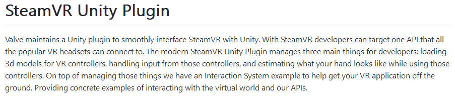 ++++立钻哥哥:Valve maintains a Unity plugin to smoothly interface “SteamVR” with Unity. With “SteamVR” developers can target one API that all the popular VR headsets can connect to. The modern “SteamVR Unity Plugin” manages three main things for developers: loading 3d models for VR controllers, handling input from those controllers, and estimating what your hand looks like while using those controllers. On top of managing those things we have an “Interaction System” example to help get your VR application off the ground. Providing concrete examples of interacting with the virtual world and our APIs.(Valve维护了一个Unity插件,可以顺利地与Unity接口“SteamVR”。使用“SteamVR”,开发者可以将所有流行的VR头盔连接到一个API上。现代的“SteamVR Unity插件”为开发者管理了三件主要的事情:为VR控制器加载3d模型,处理来自这些控制器的输入,以及在使用这些控制器时估计你的手的样子。在管理这些事情之上,我们有一个“交互系统”的例子来帮助您的VR应用程序起步。提供与虚拟世界和我们的api交互的具体示例)
