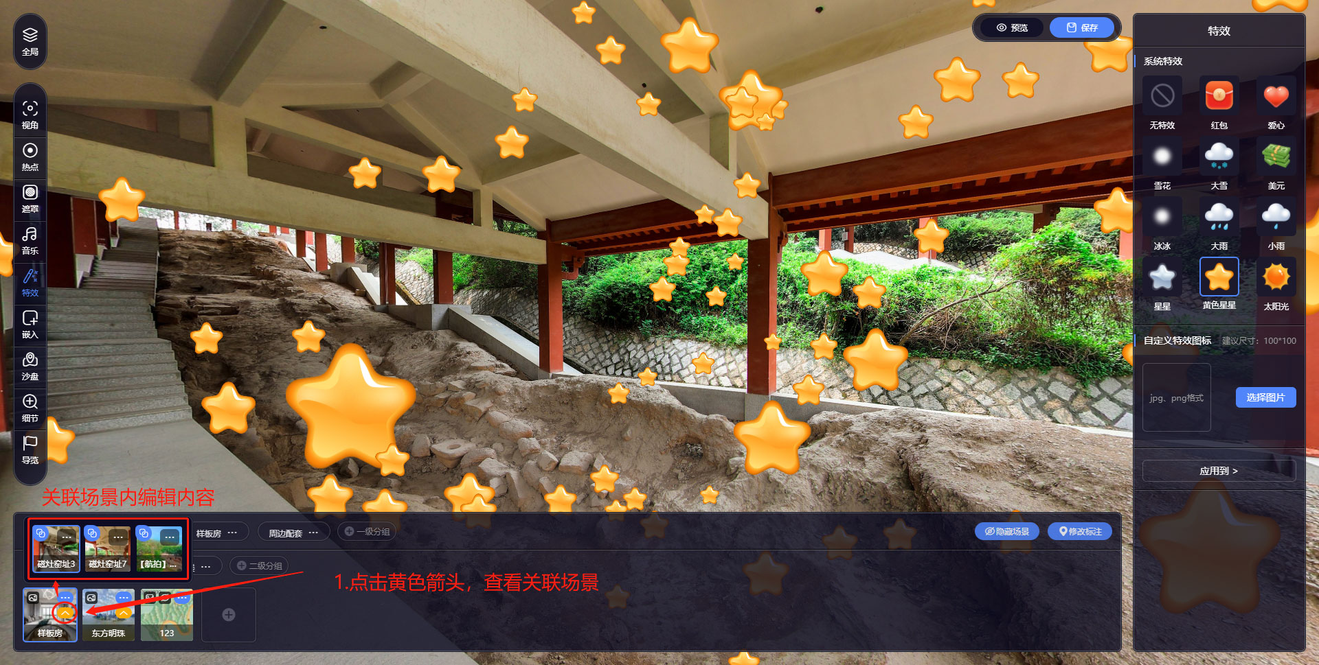 关联场景,是某个场景下的子场景,也可以理解为VR漫游作品的三级分组;