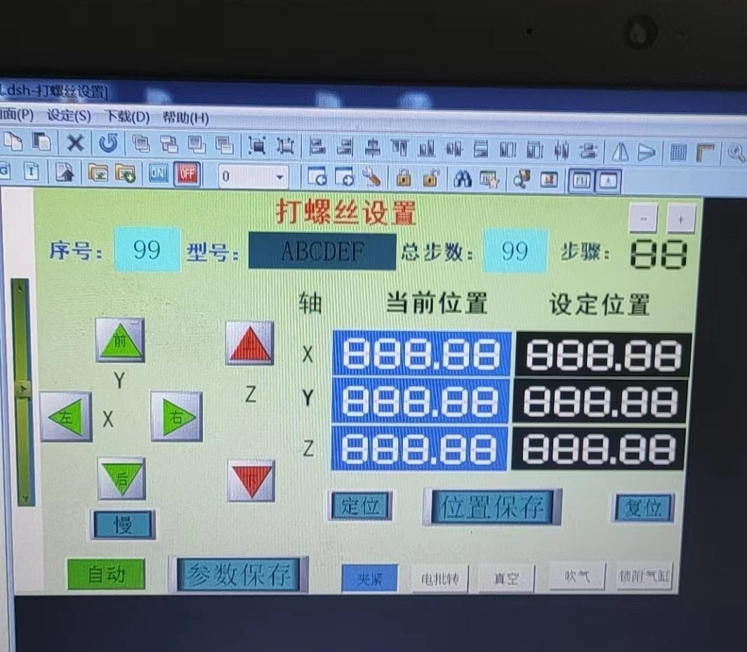 先看硬件配置:X轴负责横向移动,Z轴升降锁螺丝,Y轴带着整个XZ模块纵向跑位。吸钉式电批通过真空传感器检测吸钉状态,三轴都配了原点传感器。显控TK6071IQ触摸屏通过422口连PLC,配方参数直接映射到D寄存器区。