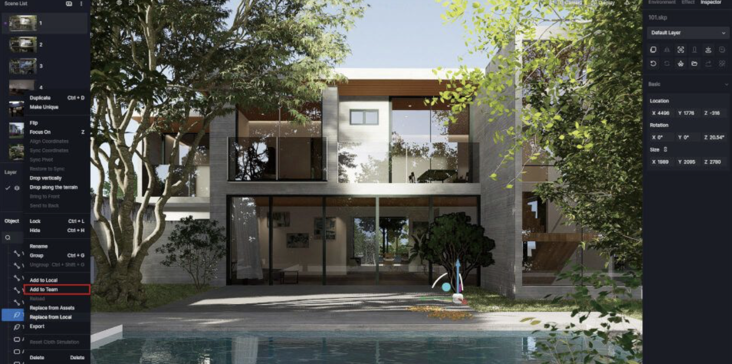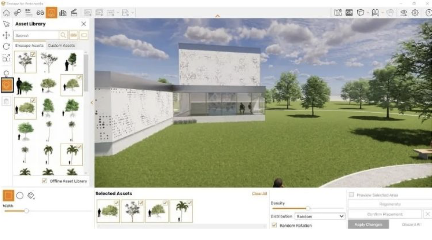 - 海量内置素材库: 提供极其丰富的树木、人物、车辆、家具等高质量配景模型和材质。