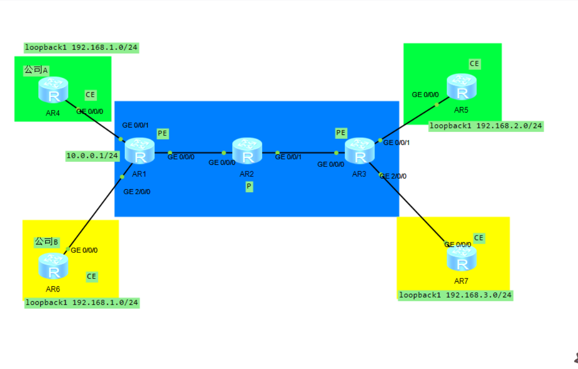 如图,右边设备R5,R7分别为公司A,公司B的分部公司,现要求公司A能够与其分布进行相互访问,公司B能够与其分布进行相互访问,按照如图所示地址进行配置。蓝色表示运营商网络用ISIS做通