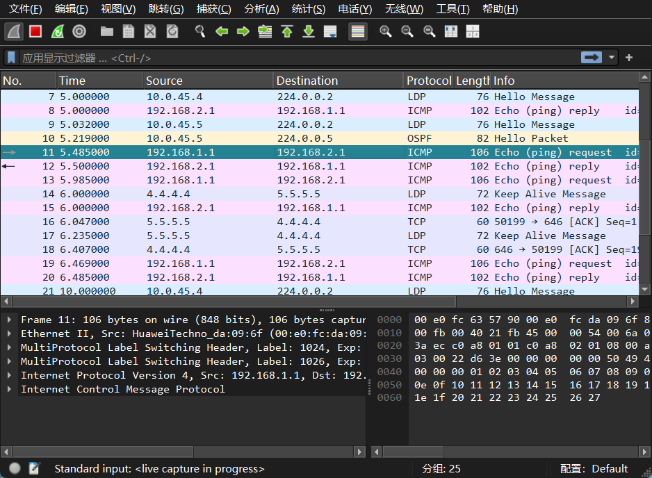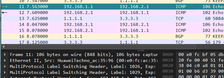 R7将数据发出来到R1,R1上看路径MP-BGP为其打上私网标签1029,查下一跳迭代3.3.3.3,打上1026的公网标签抓个包看看确实如此