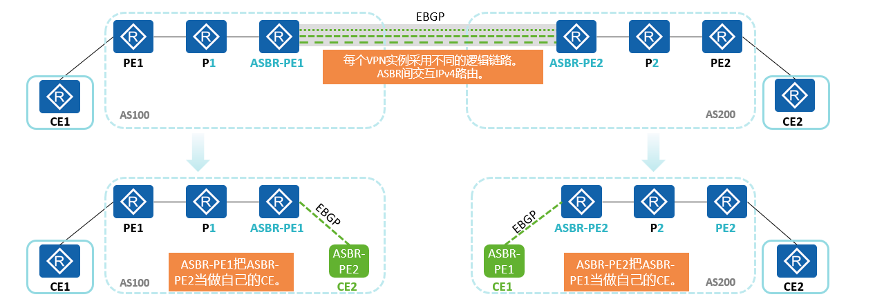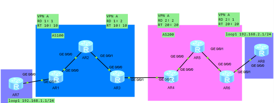 跨域搭建其实就一个点:怎样实现不同域之间的路由传递,对于OptionA来说,其将其他区域视为自己的接入用户,配置对应的VRF对接相关路由,将ASBR-PE间建立对应的动态路由协议以实现路由传递