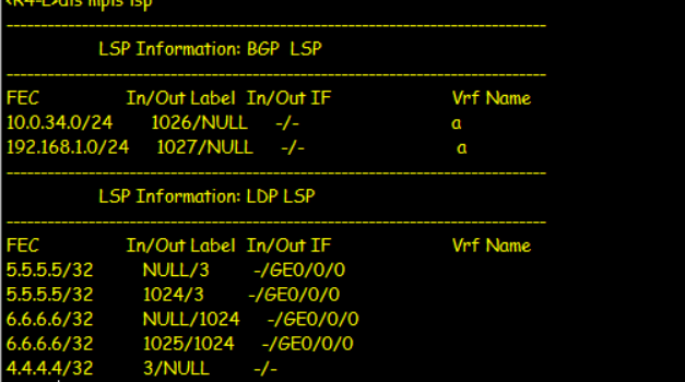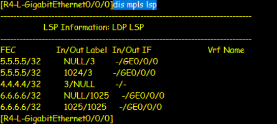 R4收到表项查表发现打上1026的私网标签递交R6,此时查表要打上1024的公网标签