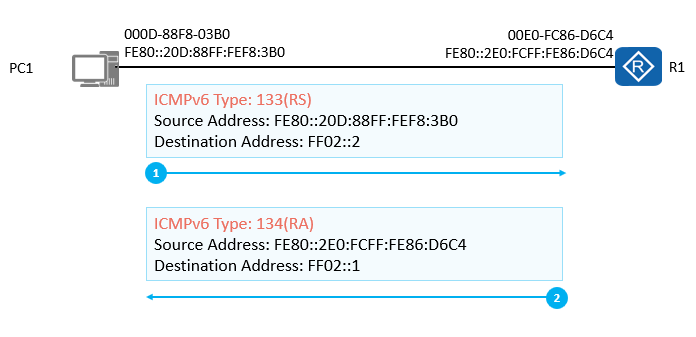 该功能由主机主动发送RS报文等待对方回应RA报文实现也可以通过对端周期性更新RA报文(时间间隔随机,在200-600s之间,目的地址为FF02::1)