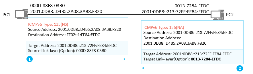PC1发送一个NS报文到网络上,目的地址为PC2对应的被请求节点组播地址(FF02::1:FF84:EFDC),选项字段中带上PC1的Mac地址000D-88F8-03B0
